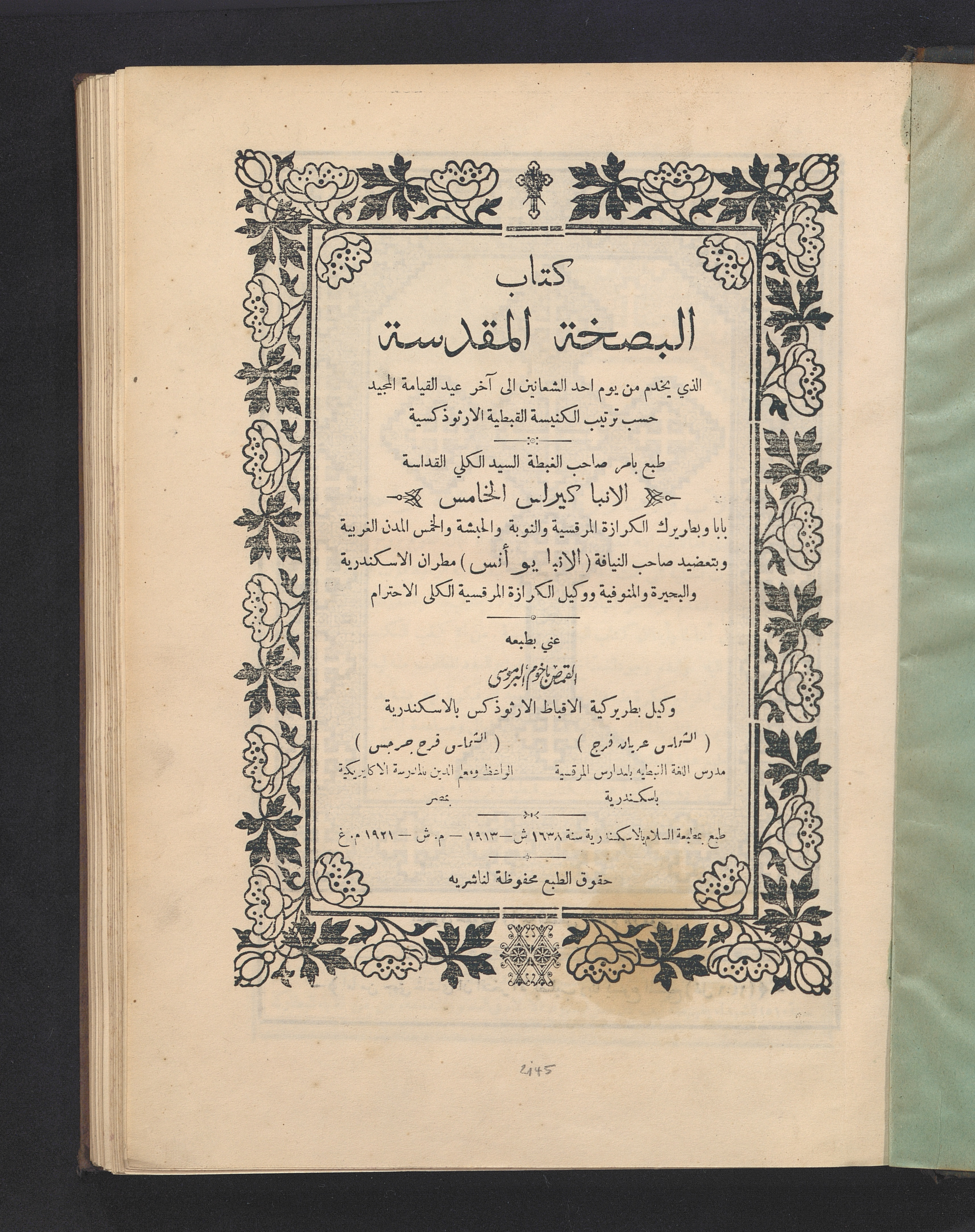 | "كتاب البصخة المقدسة، الذي يخدم من يوم احد الشعانين إلى آخر عيد القيامة المجيد" (كاتاميروس عربي) طبع بأمر صاحب الغبطة السيد الكلي القداسة الأنبا كيرلس الخامس، عني بطبعه القمص باخوم البرموسي والشماس عريان فرج والشماس فرج جرجس، الطبعة الأولى 1921م. |